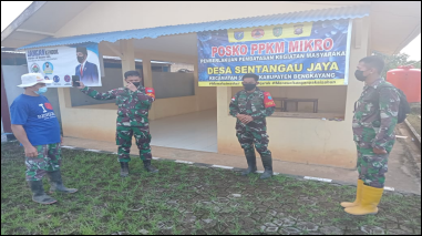 Bengkayang – Dansatgas TMMD Ke-111 Letkol Inf Condro Edi Wibowo S.Sos., M.Han didampingi Pasi Ter Kodim 1202/Skw, dan Babinsa meninjau langsung Posko Pemberlakuan Pebatasan Kegiatan Masyarakat (PPKM) Skala Mikro di Dusun Trimulya Desa Sentangau Jaya Jalan Trans Segorong Kecamatan Seluas Kabupaten Bengkayang.
