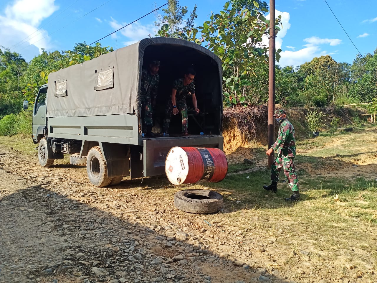 Untuk mempercepat pembangunan, Satgas TMMD menerjunkan beberapa kendaraan bermotor maupun truk. Karena itu, bahan bakar untuk operasi kendaraan sudah tersedia di Pos Satgas.