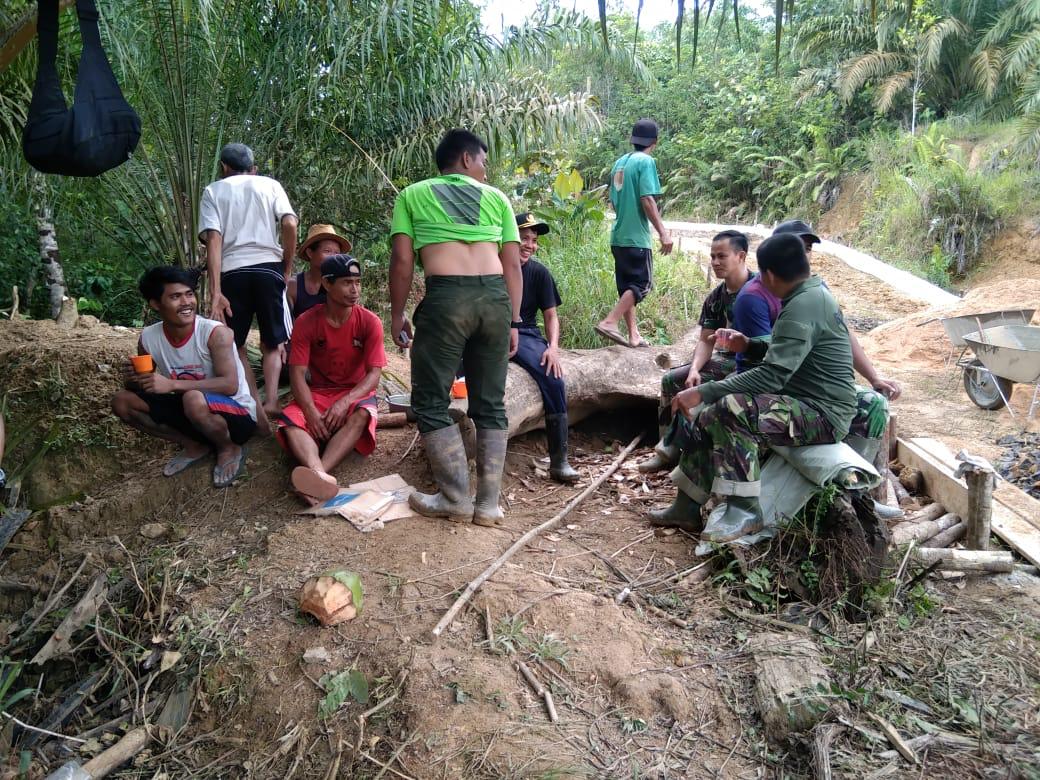 Bengkayang – Disela-sela waktu istirahat siang Serda Yanto melaksanakan komunikasi sosial dengan masyarakat di sekitar lokasi sasaran fisik TMMD.