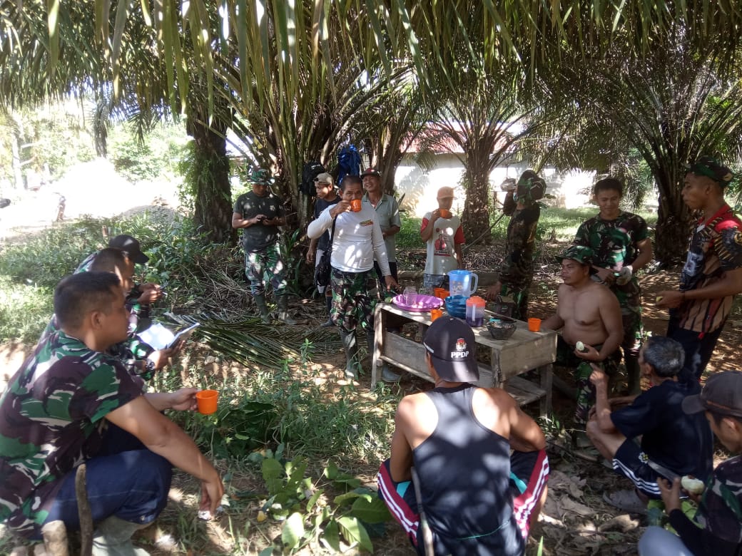 Bengkayang– Satgas TMMD ke- 111 tahun 2021 di Desa Sentangau Jaya sedang istirahat sejenak turun minum melepas lelah setelah melaksanakan pengecoran jalan di Desa Sentangau Jaya, Kecamatan Seluas, Kabupaten Bengkayang.