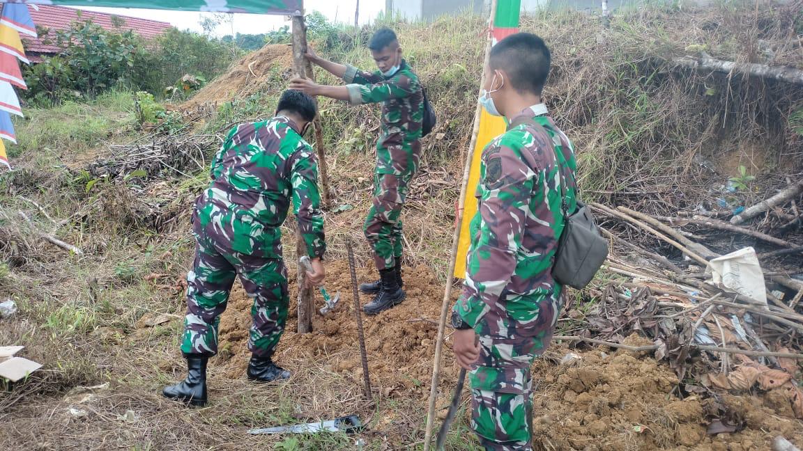 Bengkayang – Anggota Satgas TMMD ke-111 Kodim 1202/Skw Serka Petrus bersama dua rekannya Serda Yeremia dan Serda Dhika Arminia memasang banner untuk menyambut kunjungan Tim Wasev di Desa Sentangau y, Kecamatan Seluas, Kabupaten Bengkayang.