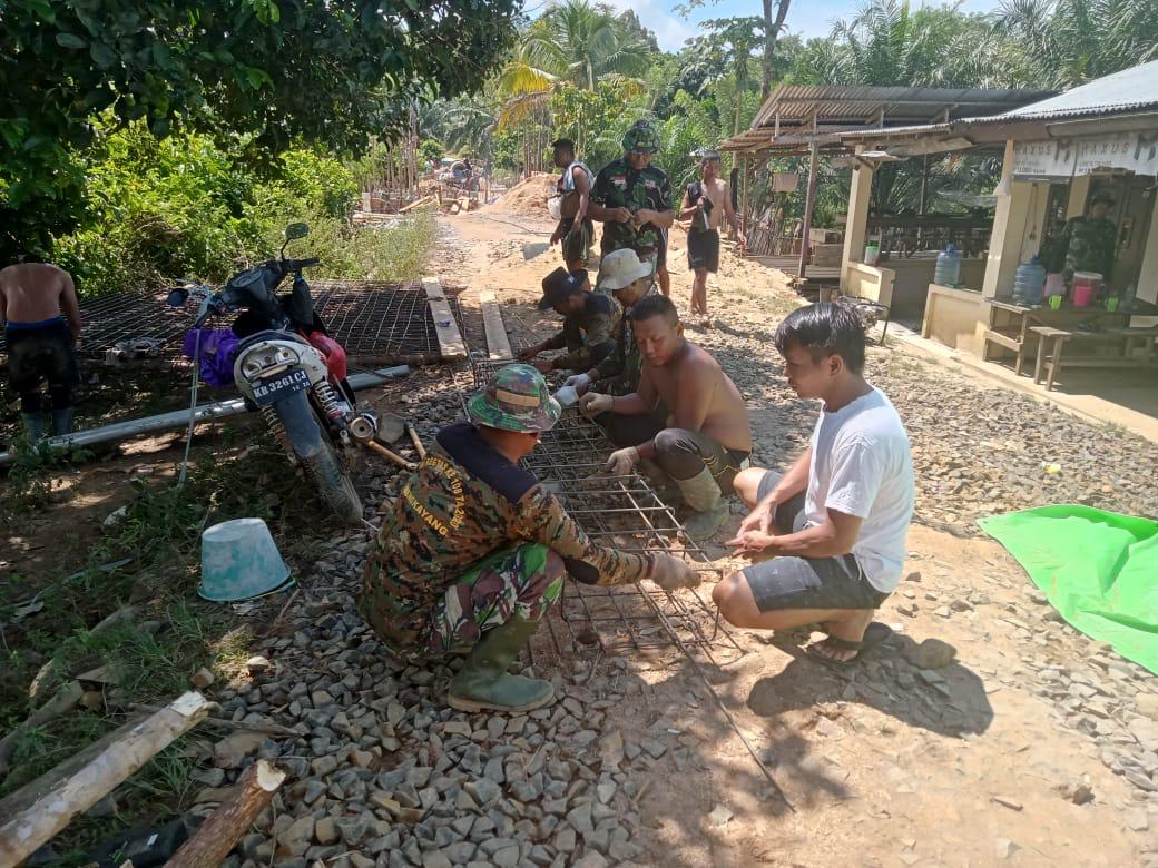 Bengkayang – Anggota Satgas TMMD ke-111 Kodim 1202/Singkawang bersama warga mulai merangkai kawat besi guna kerangka jembatan di Dusun Trimulya, Desa Sentangau Jaya, Kecamatan Seluas, Kabupaten Bengkayang Kelurahan.