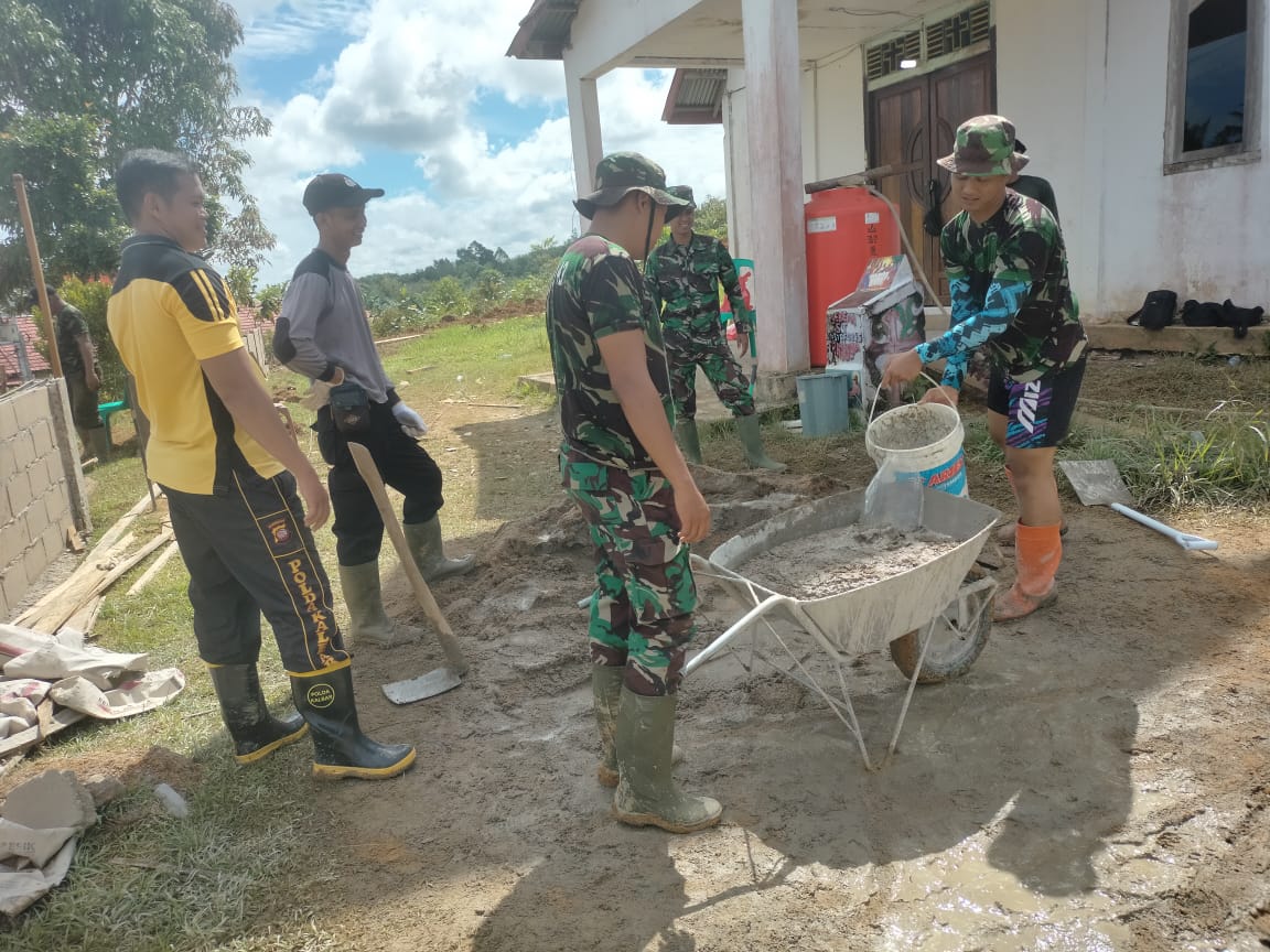 Tampak anggota satgas TMMD Praka Firmansyah bersama warga bersinergi bersama-sama dalam meramu adukan semen.