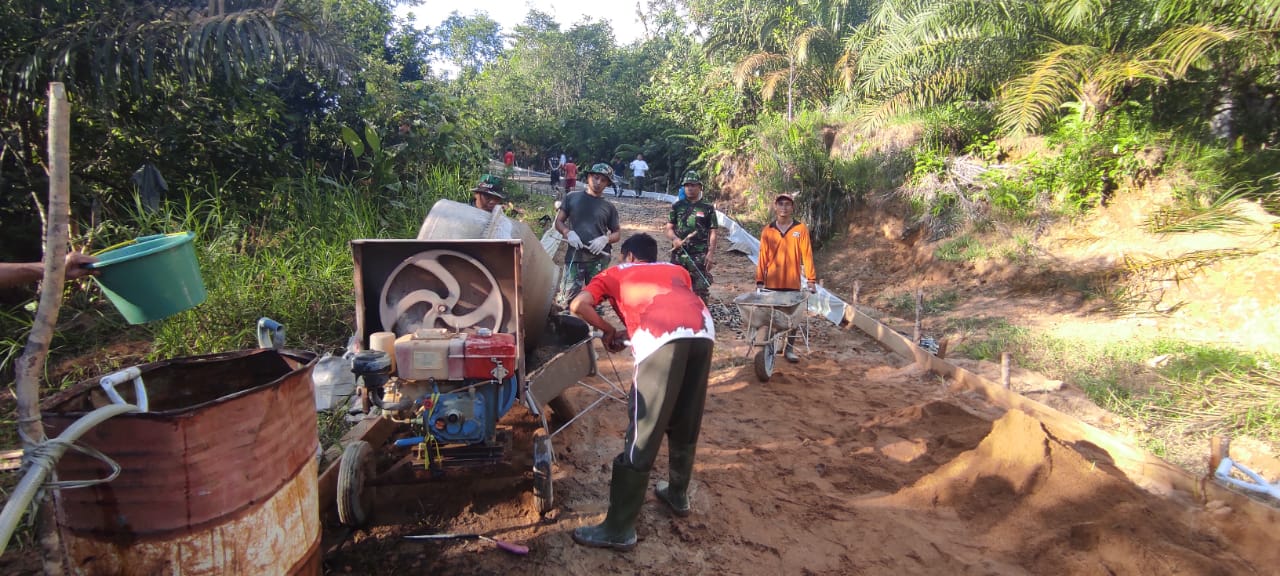 Anggota Satgas TMMD ke-111 Kodim 1202/Singkawang bersama masyarakat terlibat pengerjaan cor jalan di program fisik TNI Manunggal Masuk Desa (TMMD) ke-111, tak ketinggalan Bpk Timotius (52) warga Desa Sentangau Jaya pun ikut serta membantu agar pengerjaan cepat selesai.