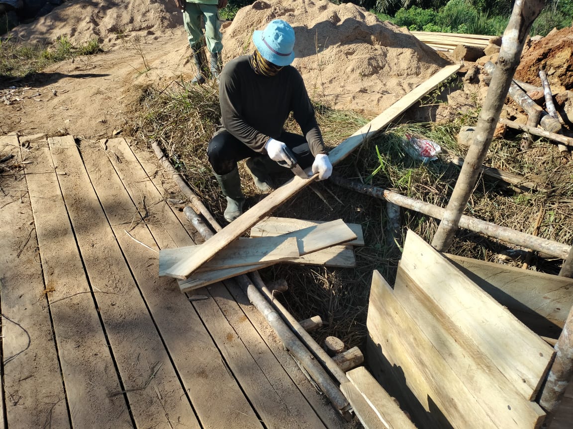 Bengkayang – Anggota Satgas TMMD 111/ Kodim 1202/SKW Kopda bernad lanjutkan pengerjaan SAS ke-5 pembangunan jembatan, membuat papan mal untuk penahan cor jembatan beton di Desa sentangau jaya kec. seluas kab. bengkayang.