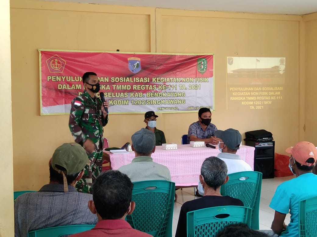 Bengkayang – Sertu Hendrik memberikan materi Bela Negara dan Wawasan Kebangsaan kepada warga masyarakat di Dusun Trimulya Desa Sentangau Jaya Jalan Trans Segorong Kecamatan Seluas Kabupaten Bengkayang.