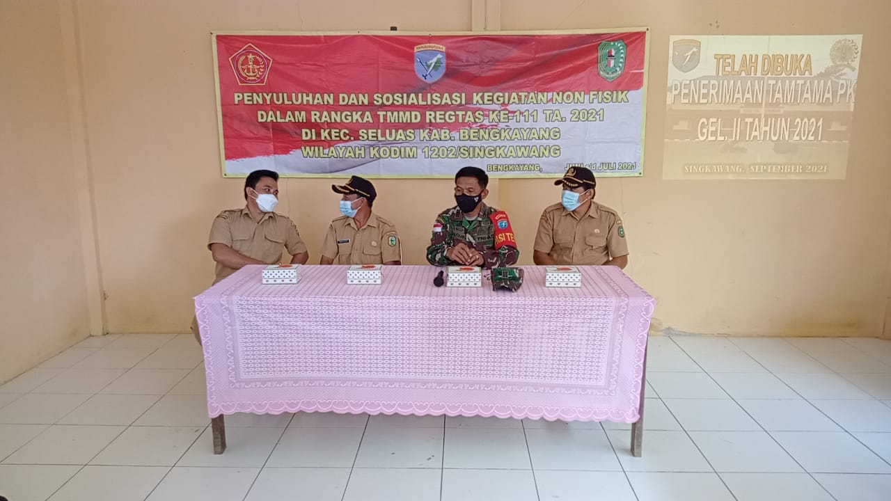 Bengkayang – Telah dimulainya TNI Manunggal Membangun Desa (TMMD) ke-111 tahun 2021, Kodim 1202/Singkawang melaksanakan Sosialisasi kepada segenap elemen masyarakat yang bertempat di Balai Desa Sentangau Jaya, Kecamatan Seluas, Kabupaten Bengkayang