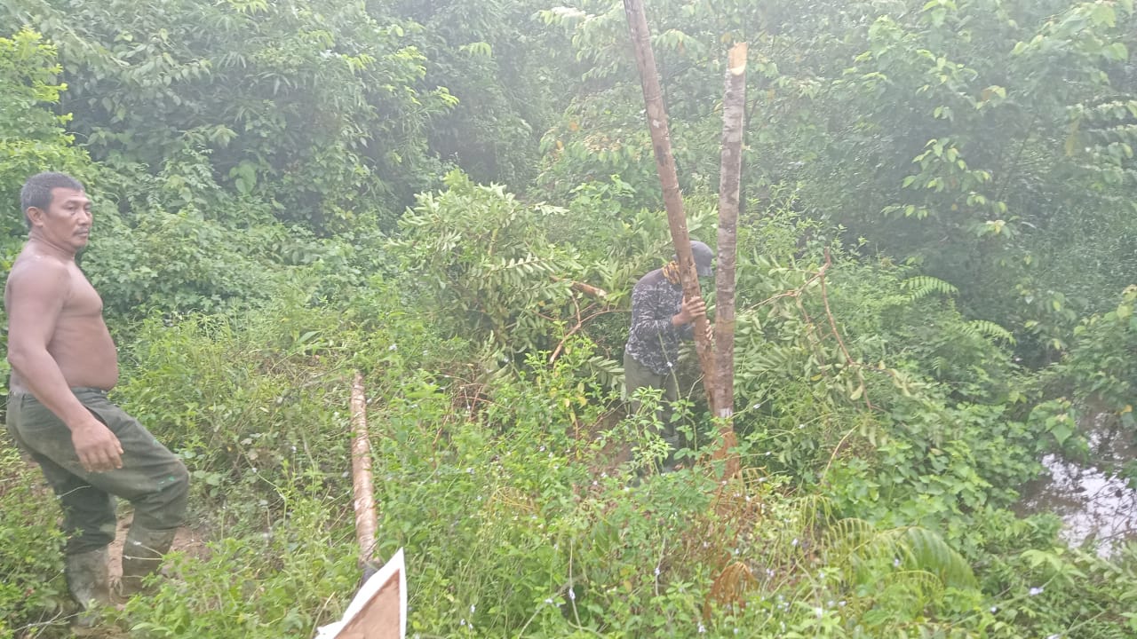 Bengkayang – Satgas TMMD Ke-111 Kodim 1202/Singkawang gotong royong bersama warga untuk membuat jembatan penghubung sementara antara Dusun Trimulya dan Dusun Sangge di Desa Sentangau Jaya, Kecamatan Seluas, Kabupaten Bengkayang.