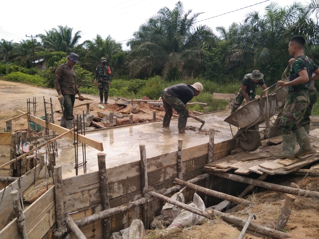 Selaku Dansatgas Kodim 1202/Skw Letkol Inf Condro Edi Wibowo S.Sos.M.Han Mengatakan,Beberapa hari kemarin cuaca kurang memungkinkan. “Tetapi siang ini sudah ada panas sedikit, dan mengerahkan tenaga secara gotong-royong dengan alat seadanya untuk melakukan tahapan Penyelesaian pengecoran lantai jembatan,” ucapnya.