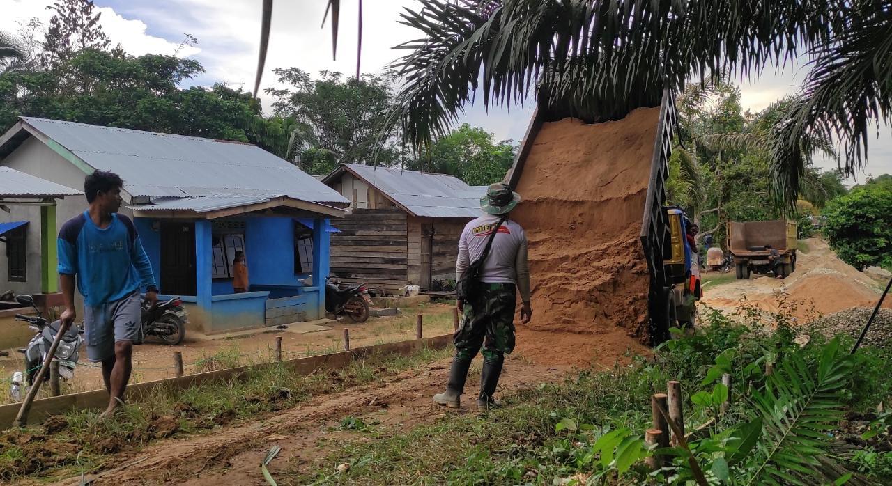 Seperti yang dilakukan anggota satgas TMMD 111, dengan begitu bersemangat menurunkan material pasir. (Pendim 1202/Skw)