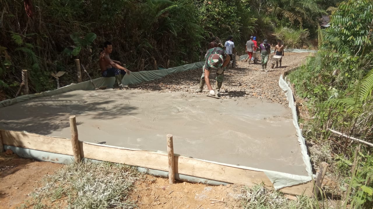 Bengkayang – Personel Satgas TMMD ke-111 Kodim 1202/Skw dibantu dengan warga melakukan pengecoran jalanan yang rusak di Desa Sentangau Jaya, Kecamatan Seluas, Kabupaten Bengkayang.