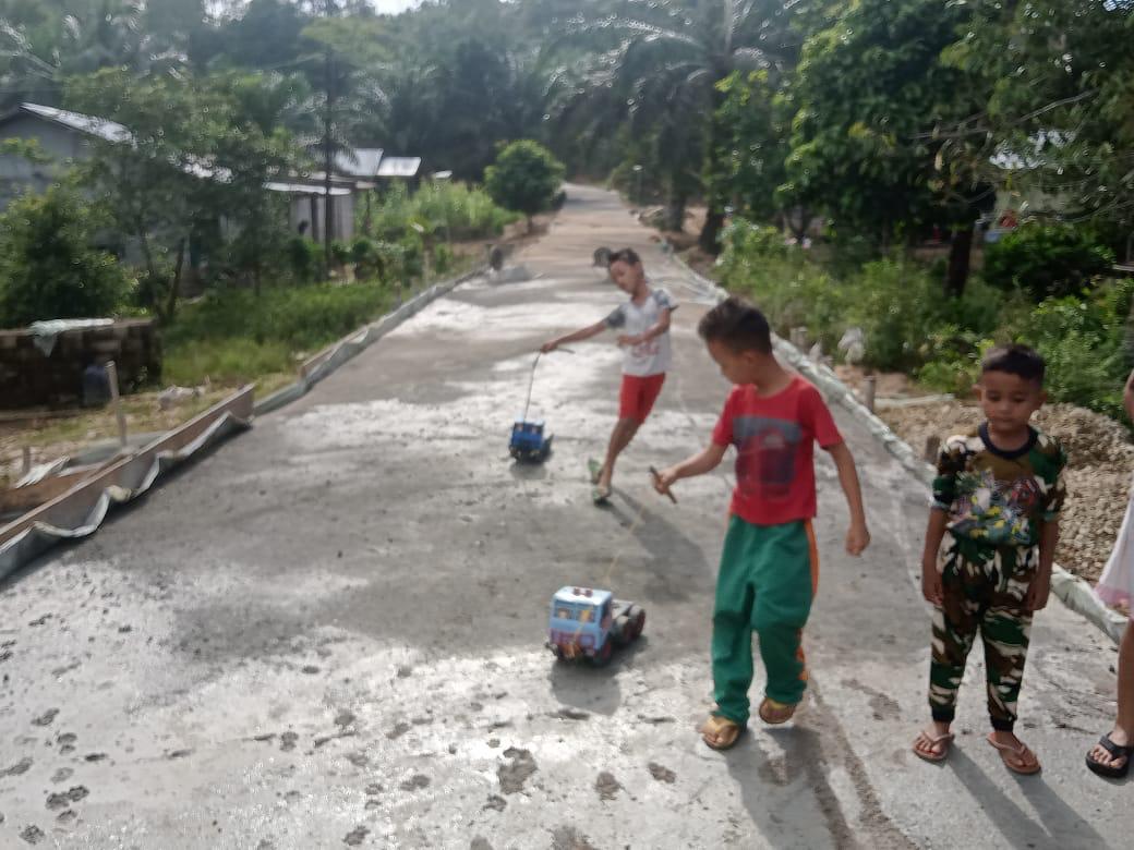 Kebahagiaan anak anak menikmati jalan baru terlihat dari raut riang mereka berlari-lari menikmati jalan baru itu sambil memainkan mobil main mainan mereka, Dan sesekali mengobrol dengan bapak TNI yang sedang bekerja.