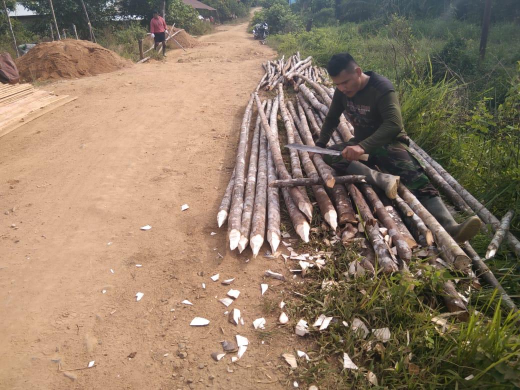 Bengkayang- Rabu (16/06/2021) anggota Satgas TMMD ke – 111 Kodim 1202/skw pratu Ahmad Saiman menyiapkan kayu untuk pendukung konstruksi pembangunan jembatan di Desa sentangau Kec. Seluas kab. Bengkayang.