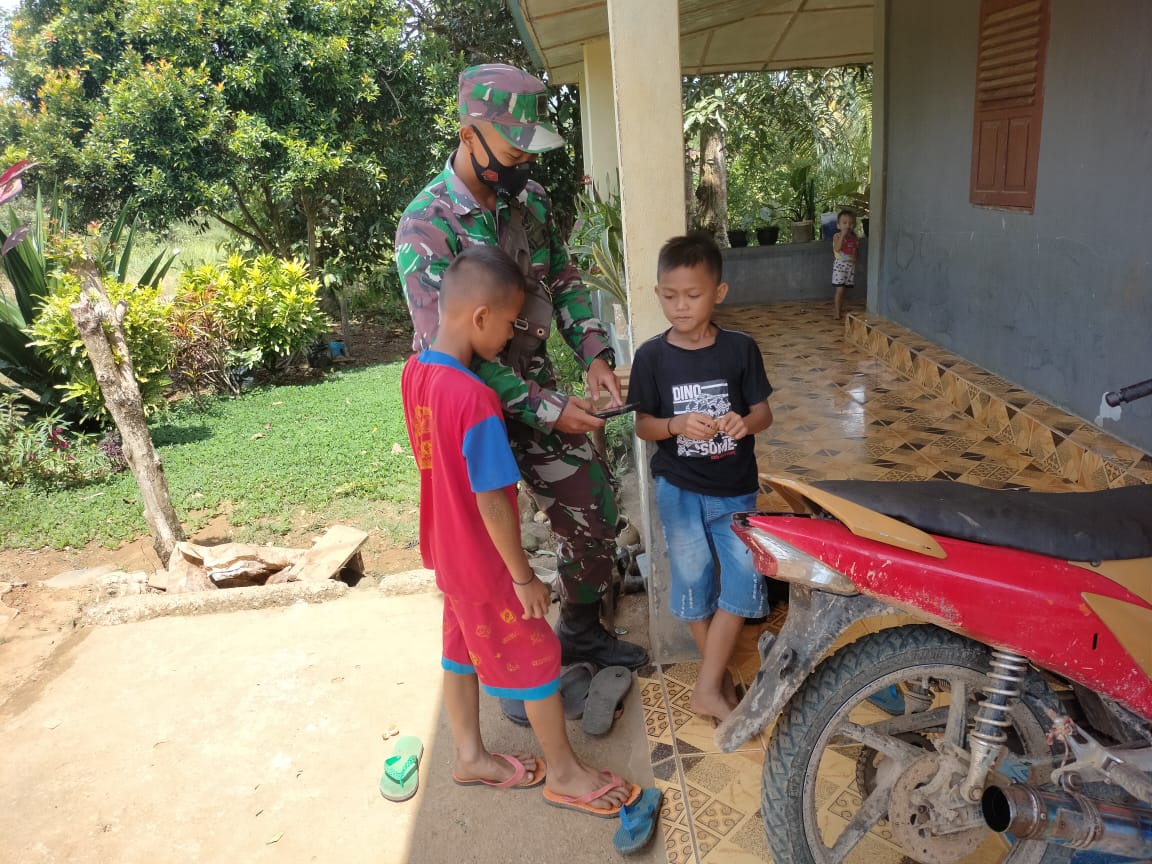 Serda Dika salah satu anggota Satgas TMMD Ke-111 Kodim 1202/Skw dalam kesempatan istirahat siang melaksanakan kegiatan komunikasi sosial terhadap anak-anak di Desa. Dika menerangkan dampak positif dan negatif dari Hp tersebut kepada anak-anak warga Desa.