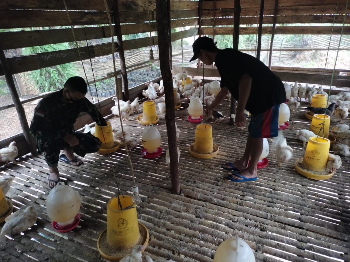 Di sela istirahat selesai bekerja, Serda Alvonsius melaksanakan Komsos dengan memberi pakan ternak ayam di peternakan warga, sehingga terlihat begitu akrab dirinya dengan warga.