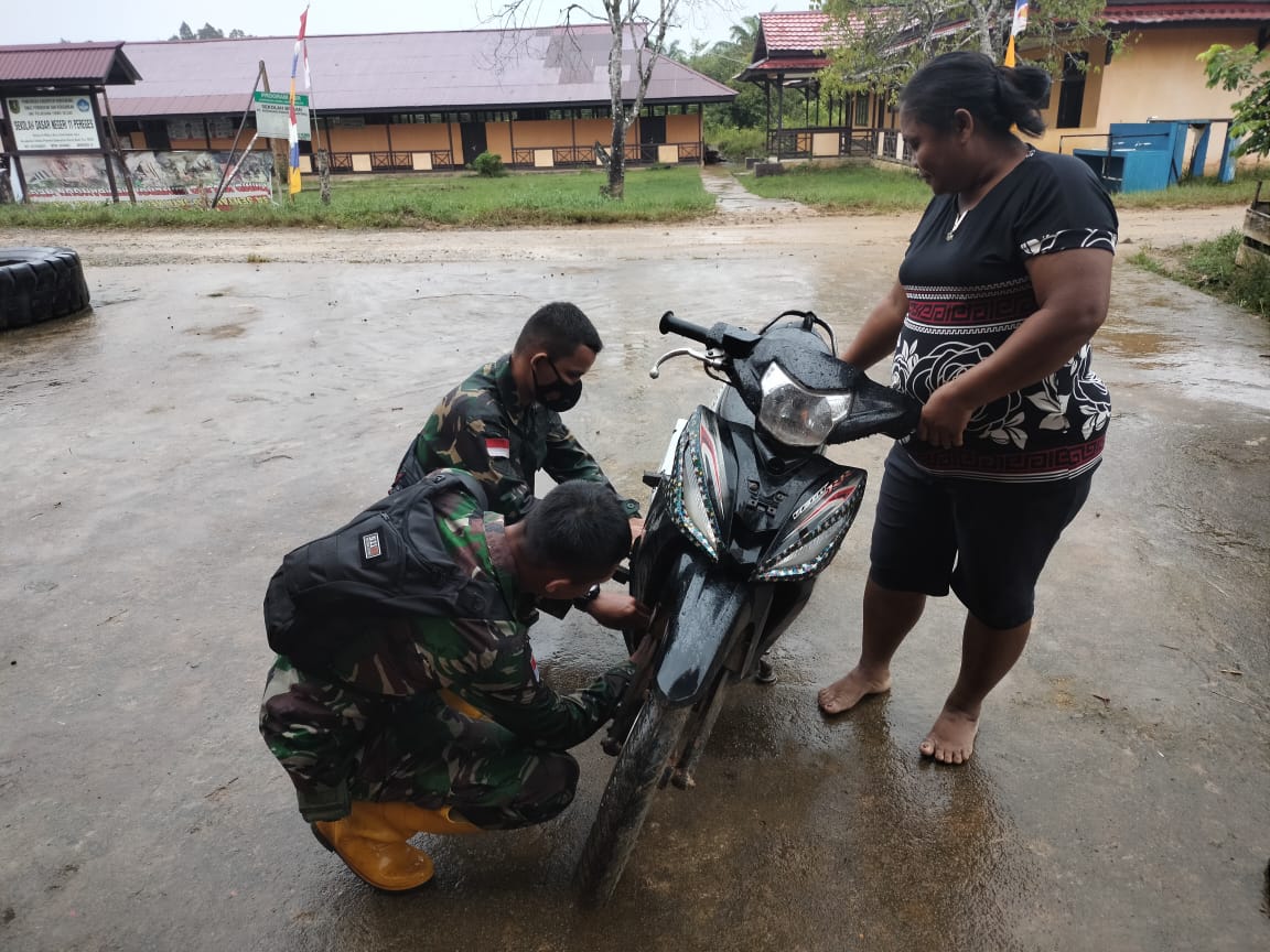 “Sepeda motor Sutini warga Desa Sentangau Jaya ada yang rusak. Kebetulan saya mempunyai keahlian bengkel sedikit, sehinnga saya bisa membantu memperbaiki sepeda motor tersebut,” kata Serda Alvonsius.