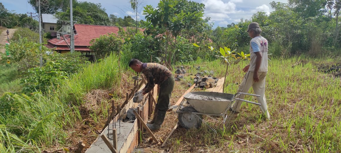 BENGKAYANG — Anggota Satuan Tugas (Satgas) TNI Manunggal Membangun Desa (TMMD) ke 111 Kodim 1202/Singkawang bersama masyarakat Mengecor pondasi Pagar pembangunan Gereja Santo Kristoforus di Desa Sentangau Jaya Jalan Trans Segorong Kecamatan Seluas Kab Bengkayang.