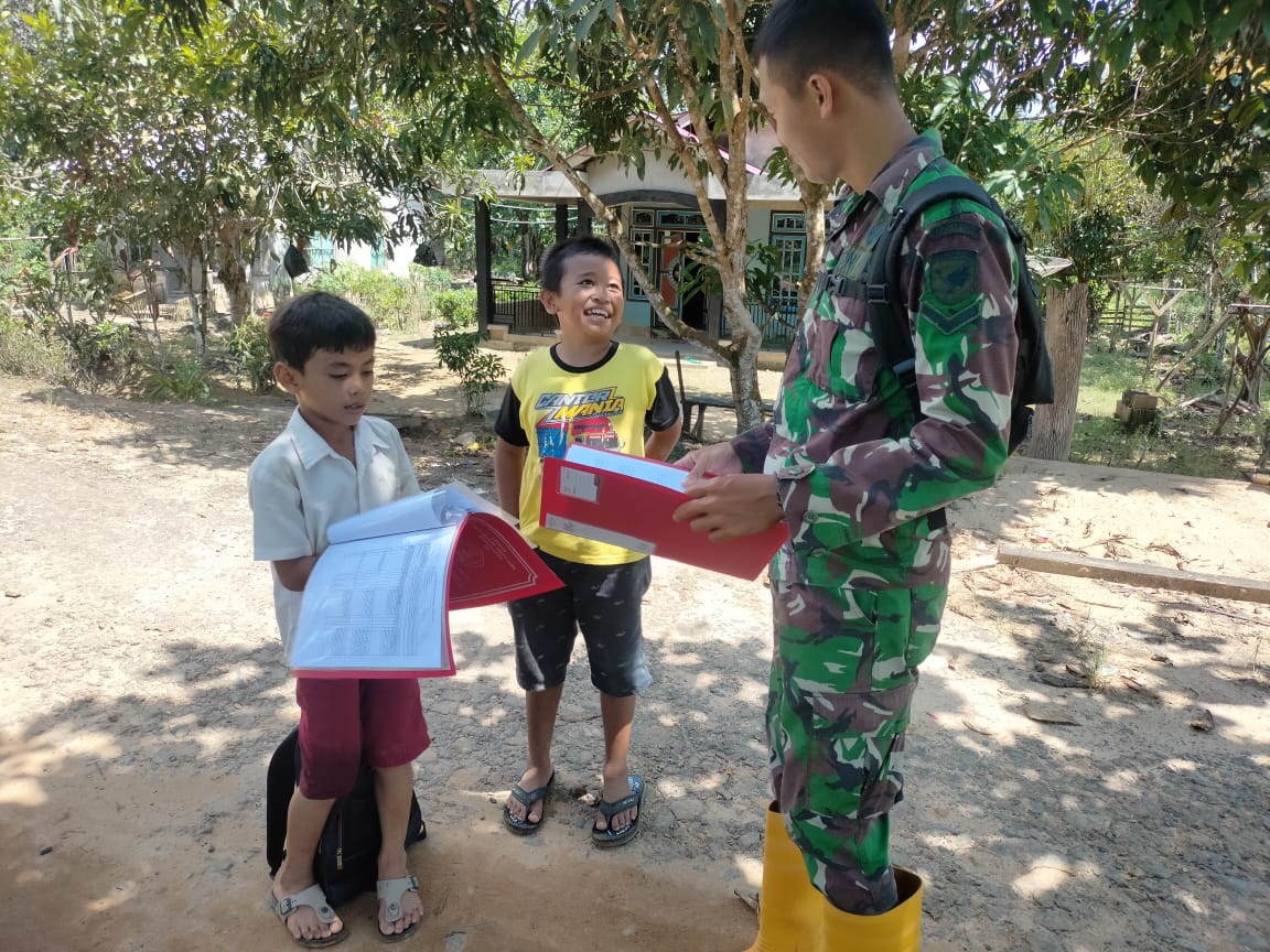 BENGKAYANG – Disela – sela waktu luang satgas TMMD Desa Sentangau Jaya Jalan Trans Segorong Kecamatan Seluas Kab Bengkayang, Serda Stefelik Endry memberikan motivasi kepada Siswa SD kelas 6 Desa Sentangau Jaya, anak- anak mengeluhkan, kapan pademi covid-19 ini berakhir.