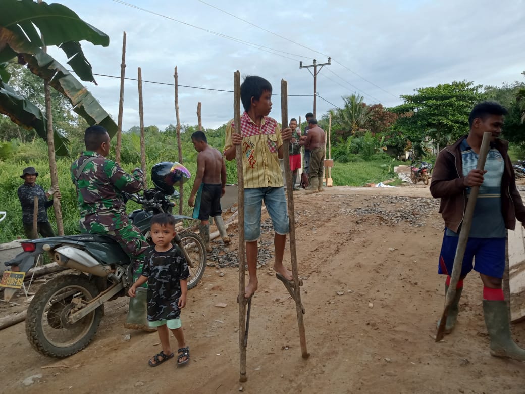 Di sela waktu istirahatnya mengerjakan pekerjaan pembangunan, anggota Satgas TMMD mengajak anak-anak Desa sentangau bermain egrang yang merupakan galah atau tongkat yang digunakan seseorang agar bisa berdiri dalam jarak tertentu di atas tanah.