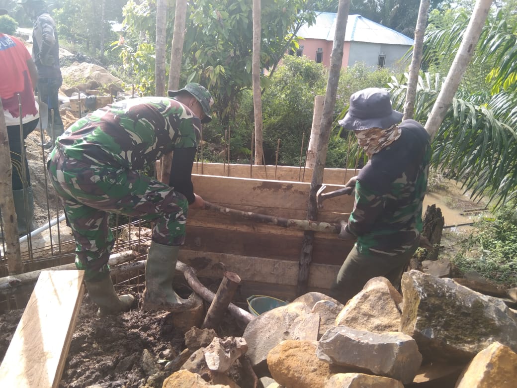 Semangat kebersamaan dan gotong royong itu tampak saat Serda Parani bersama warga memasang papan mal pondasi jembatan.