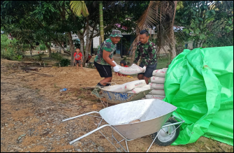 Bengkayang – Satgas TNI Manunggal Membangun Desa (TMMD) ke-111, Kodim 1202/Skw, gunakan arco untuk mengangkut semen untuk pengecoran.