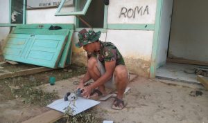 Bengkayang – Anggota TMMD 111/ Kodim 1202/Skw Serda Samuel Slamet, melaksanakan Komunikasi Sosial (komsos) dengan perangkat Desa Sentangau Jaya, Kecamatan Seluas, Kabupaten Bengkayang, Selasa (15/6/2021).