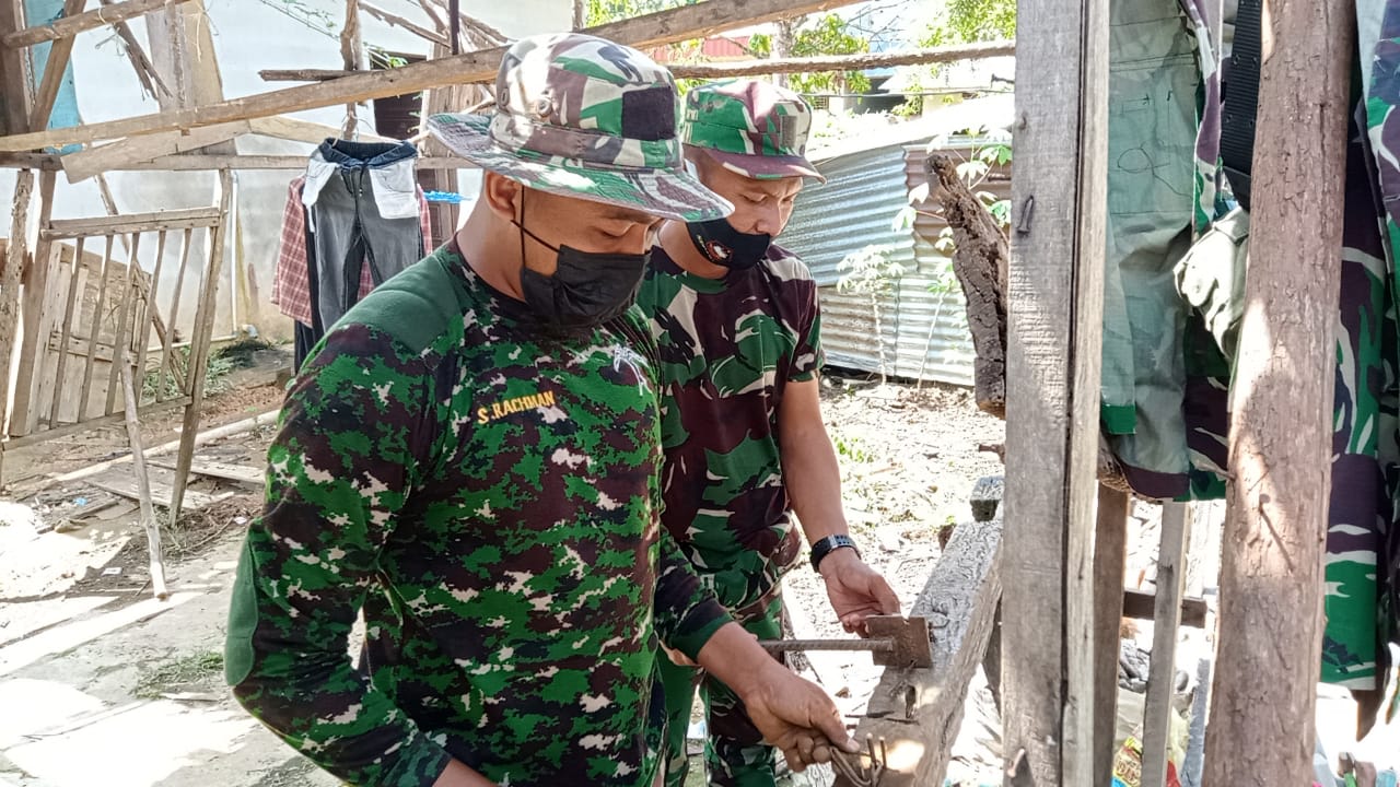 Bengkayang – Satgas TMMD ke 111 Kodim 1202/Skw melanjutkan merakit besi menjadi kerangka mal yang akan digunakan sebagai landasan untuk pengecoran pembuatan jembatan bersama dengan masyarakat.