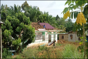 Terlihat anggota satgas pasang seng sedang merakit segala sesuatunya untuk pemasangan, ada yang di bawah sebagai pendukung ada juga yang naik ke bagian atap untuk masang lembaran seng.