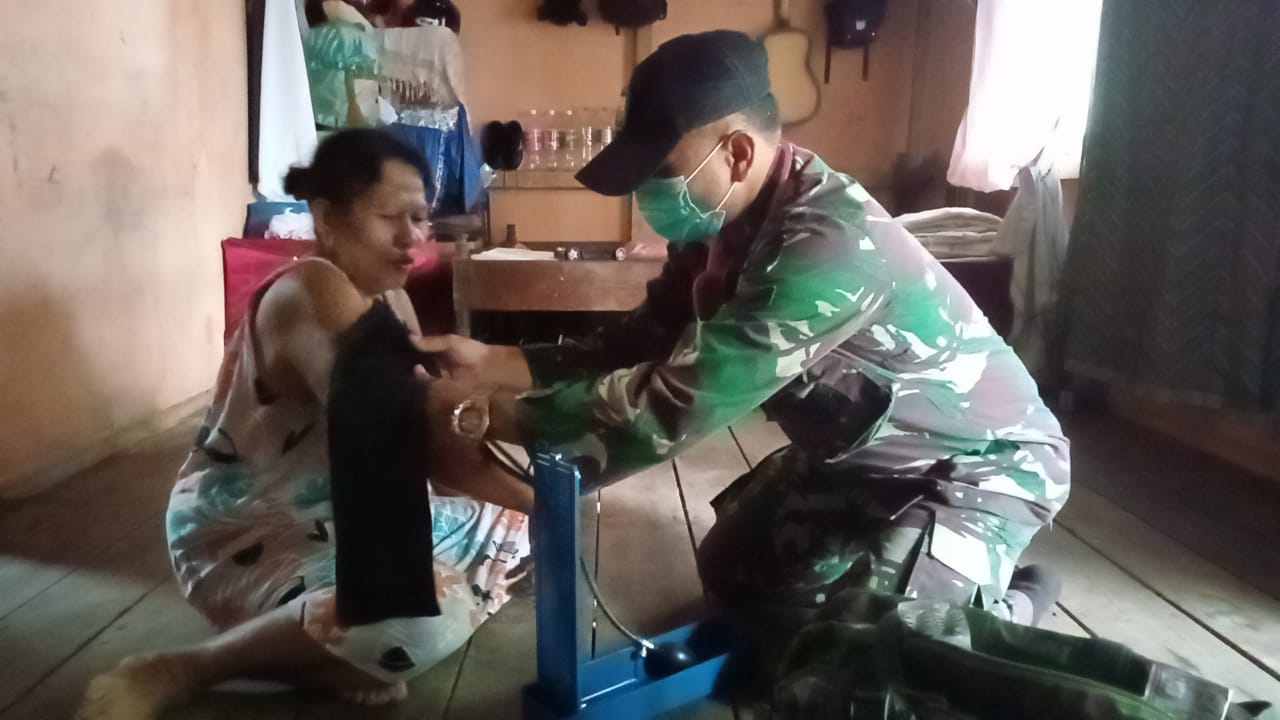 Anggota Kesehatan Serda Fuzi mengatakan, masa pandemi Covid-19 harus tetap waspada, kebetulan ada masyarakat yang merasa dirinya kurang sehat, maka tim kesehatan langsung melakukan pemeriksaan yang diawali dengan pengukuran tensi darah dan suhu tubuh.