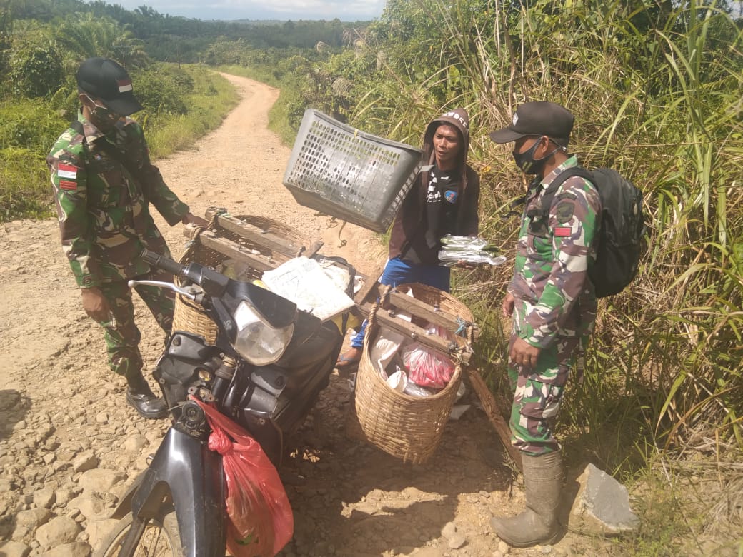 Melihat hal tersebut, anggota Satgas TMMD Ke-111 Kodim 1202/Skw Praka Sihotang dengan Praka M. Rojiin langsung membantu dan menggemaskan barang belanjaan yang terjatuh di tanah lalu mendorong motor hingga menyala kembali. Selanjutnya motor warga dapat melintas di jalan penghubung yang belum beraspal tersebut.