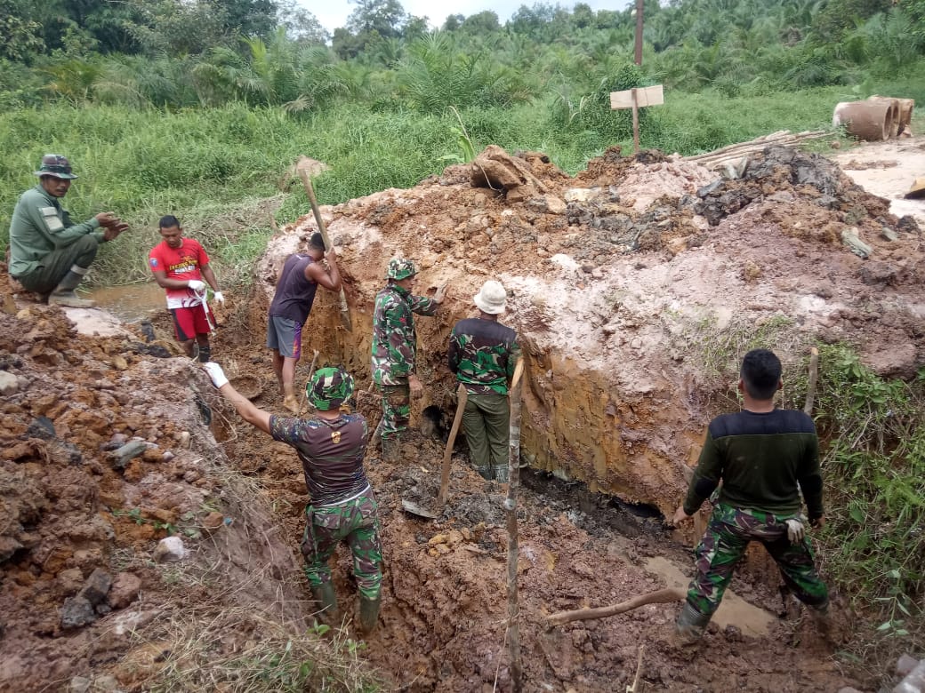 Terlihat salah seorang anggota Satgas TMMD yaitu Sertu Jarwani, sedang menggali tanah dengan menggunakan cangkul untuk pembuatan gorong-gorong jembatan, dan beberapa personil lainnya ikut menggali untuk membantu meratakan pinggiran dilokasi tersebut.