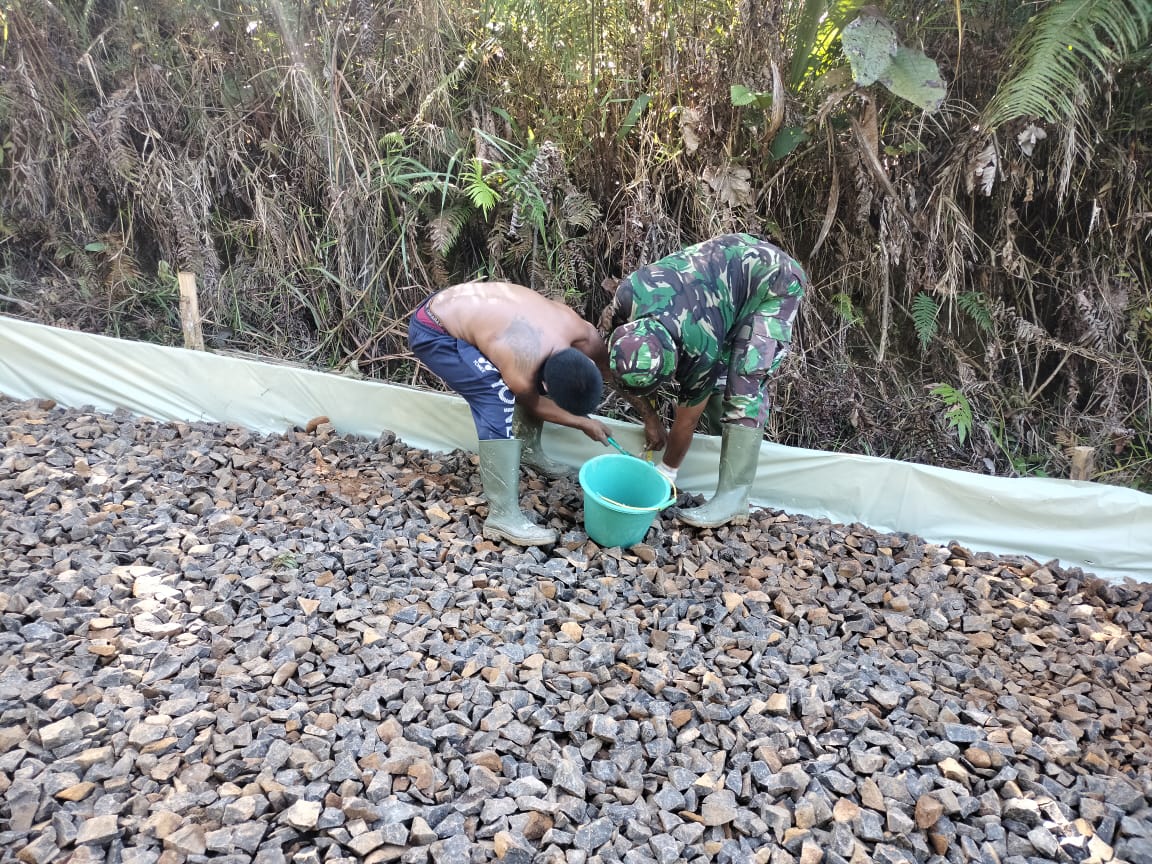“Kalau kita bergotong royong bahu membahu bersama masyarakat kerjaan akan menjadi ringan, kesehatan akan tetap terjaga dengan mengerakan tubuh kita. . Seperti pembuatan jalan yang sedang kita bangun,” ujar Serda Yeremia. (Pendim 1202/Skw)