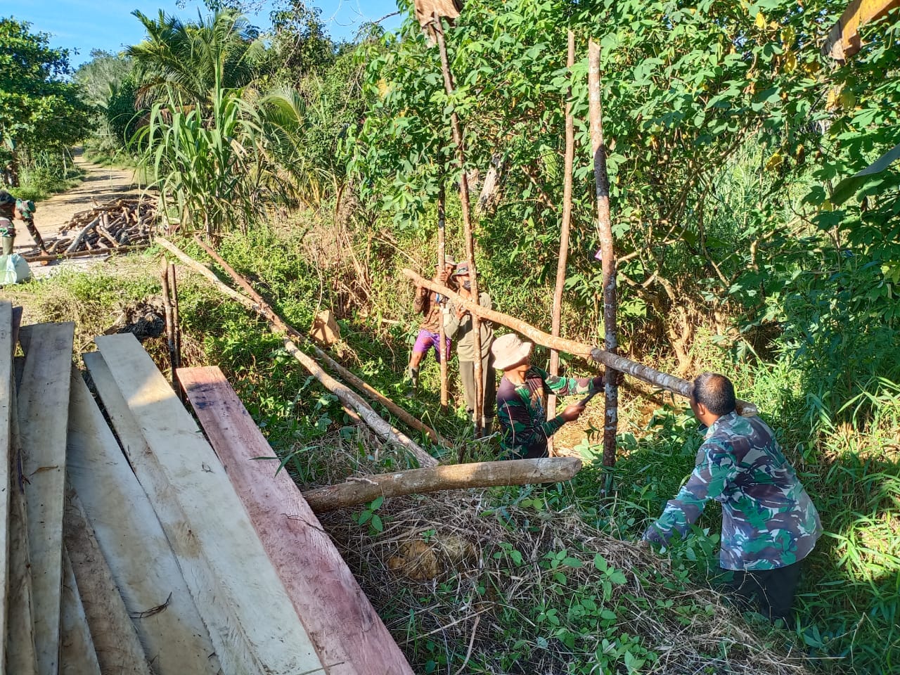 Bengkayang – Satgas TMMD Regtas ke -111 Kodim 1202/Skw membangun jembatan di Desa Sentangau Jaya Jalan Trans Segorong Dusun Trimulya Kecamatan Seluas Kabupaten Bengkayang, Rabu (15/06/2021). Tingkatkan Semangat Gotong-Royong Warga Manunggal Bersama TNI.