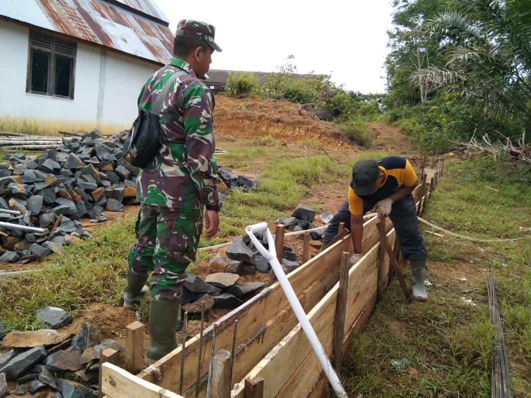 BENGKAYANG – Satgas TNI Manunggal Membangun Desa TMMD Ke-111 Kodim 1202/Singkawang bersama warga Desa Sentangau Jaya Jalan Trans Segorong Kecamatan Seluas Kab Bengkayang, warga dan anggota Satgas mengerjakan pondasi pagar Gereja Santo Kristoforus.