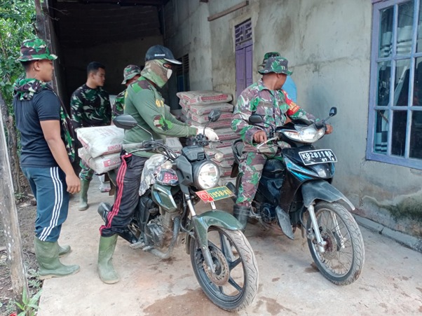 Untuk kelancaran pembangunan jalan desa yang sedang dibetonisasi, dan memastikan semua bahan material yang dipergunakan adukan tersedia, anggota TNI yang tergabung dalam satuan tugas TMMD ini dengan sigap dan tanggap melangsir semen untuk diangkut mendekat ke mesin molen.