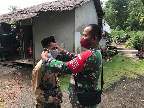Sertu Joyo salah seorang anggota satgas TMMD tampak sedang memasangkan masker ke seorang warga Desa Kuala Mandor B yang kebetulan saat itu tidak menggunakan masker saat berada di luar rumah. Kurangnya kepedulian warga terhadap disiplin protokol kesehatan 3M, membuat Sertu Joyo berinisiatif selalu membawa sekotak masker kemanapun ia pergi. Tujuannya adalah untuk mengingatkan warga agar selalu mematuhi protokol kesehatan agar terhindar dari penularan virus covid-19.