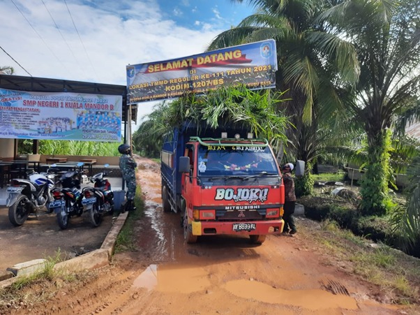 Kubu Raya – Serda Dedi anggota satgas TMMD ke-111 Kodim 1207/Pontianak membantu truk muatan bibit sawit yang tak bisa keluar dari lokasi TMMD, Sabtu (03/07/2021).