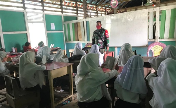 Kubu Raya – Disela waktu tugasnya mengerjakan pembangunan jalan rabat beton di Desa Kuala Mandor B, anggota satgas TMMD ke-111 Kodim 1207/Pontianak Serda Sugeng R., menyempatkan datang ke sekolah MI Nurul Mustaqim yang berada di Desa Kuala Mandor B untuk memberikan pemahaman tentang wawasan kebangsaan kepada pelajar yang ada disana. Pemahaman tentang wawasan kebangsaan ini merupakan sasaran non fisik TMMD ke-111 Kodim 1207/Pontianak, Selasa (22/06/2021).