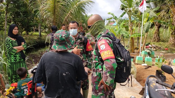 Kubu Raya – Anggota satgas TMMD ke-111 Kodim 1207/Pontianak bersama warga Dusun Maju Jaya yang sedang melewati jalan yang sudah dibangun, Rabu (14/07/2021).