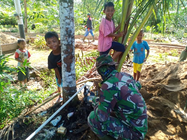 Kubu Raya – Disela-sela kesibukan pengerjaan program TMMD ke-111 Kodim 1207/Pontianak di Dusun Maju Jaya, Desa Kuala Mandor B, Kecamatan Kuala Mandor B, Kabupaten Kubu Raya, anggota satgas TMMD ini mendekatkan diri dengan berbagai kalangan masyarakat setempat diantaranya dengan anak-anak, Sabtu (03/07/2021).