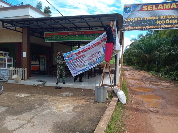 Sertu Asiani bersama kepala sekolah SMP Negeri 1 Kecamatan Kuala Mandor B memasang banner di toko ibu Ana yang berada disamping jalan masuk lokasi TMMD di Dusun Maju Jaya. Besar harapan kepala sekolah (H. Sumarno, S.Pd.,) agar animo masyarakat Kuala Mandor B ikut serta bergabung di SMP Negeri 1 guna mencerdaskan anak-anak bangsa dan mewujukan masyarakat yang cerdas berkualitas.