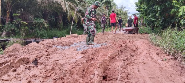 Beberapa kali diguyur hujan yang deras jalan akses untuk masuk ke lokasi TMMD ke-111 Kodim 1207/Pontianak, sangat hancur dan susah dilewati mobil pengangkut material, sehingga satgas TMMD harus menyisihkan waktu dan tenaga untuk memperbaiki jalan yang rusak parah.
