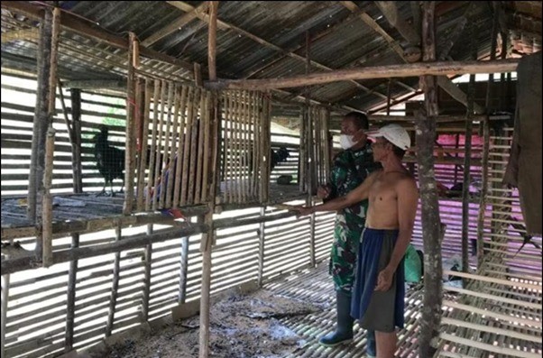 Kubu Raya – Salah seorang anggota satgas TMMD ke-111 Kodim 1207/Pontianak Serda Sugeng R. tampak sedang mengunjungi peternak ayam kampung super milik warga yang berada di lokasi TMMD ke-111 Kodim 1207/Pontianak yang berada di Desa Kuala Mandor B, Kecamatan Kuala Mandor B, Kabupaten Kubu Raya, Jumat (02/07/2021).