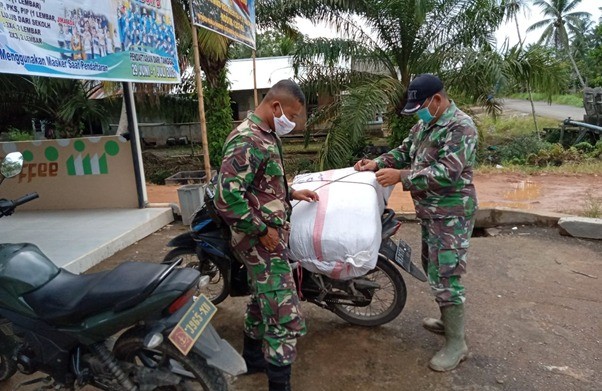 Kubu Raya – Sertu Hosnan dari staf Terdim 1207/Pontianak mendistribusikan kaporlap di lokasi TMMD ke-111 di Dusun Maju Jaya, Desa Kuala Mandor B, Kecamatan Kuala Mandor B, Kabupaten Kubu Raya, Jumat (02/07/2021).