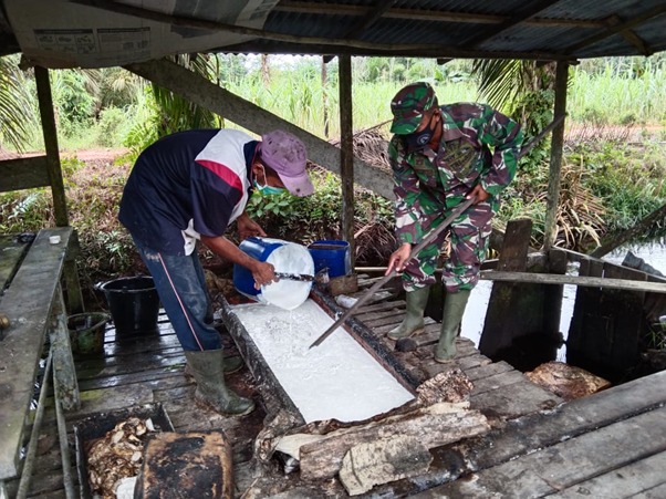 Dalam sambangnya, Sertu Hartono juga membantu bapak Musnawi membawa getah karet yang baru diambil dari kebun untuk dibekukan dalam cetakan papan yang sudah disiapkan.