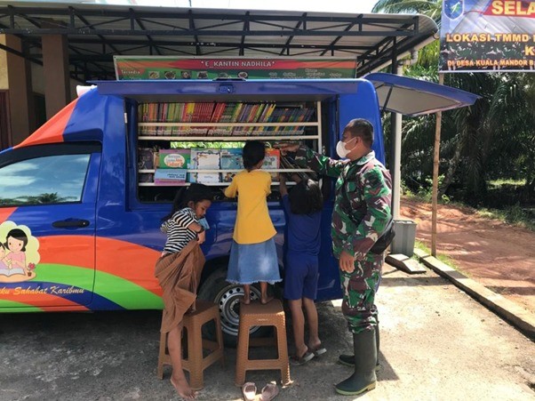 Seperti yang terlihat saat ini, perpustakaan keliling sedang berada di lokasi TMMD ke-111 Kodim 1207/Pontianak di Dusun Maju Jaya, Desa Kuala Mandor B, Kecamatan Kuala Mandor B, Kabupaten Kubu Raya. Dengan hadirnya perpustakaan keliling di lokasi TMMD, nampak terlihat antusias anak-anak yang ingin membaca di perpustakaan keliling ini. Anggota satgas TMMD ke-111 Kodim 1207/Pontianak yang saat itu sedang berada di lokasi, mengajak semua anak untuk memilih buku yang mereka inginkan untuk dibaca. Karena dengan membaca dapat menambah ilmu pengetahuan serta bisa meningkatkan kecerdasan otak anak.