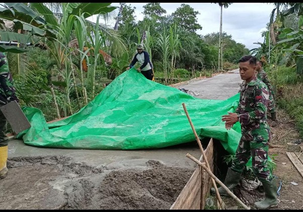 Danramil 1207-06/Sungai Ambawang Kapten Kav. Edy Darmadi menyampaikan, “Saat ini pengerjaan rabat beton jalan baru mencapai sekitar 60 meter dari total panjang jalan 1100 meter, pengerjaan ini sendiri sedikit terkendala dengan bahan material yang harus dilangsir dari titik pengedropan material ke titik awal yang kurang lebih 700 meter dan cuaca hari ini turun hujan” ujar Danramil.