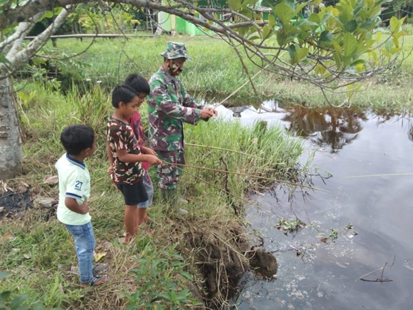 Amin (11th) yang ikut memancing ikan mengatakan, “Jika bersama bapak TNI merasa sangat senang dan selama belajar daring dirumah selain membantu orang tua dia sering bermain bersama teman-temannya. Saya nanti kalau sudah besar cita-citanya mau jadi TNI, kaya bapak tentara ini” ungkap Amin sambil tersenyum.