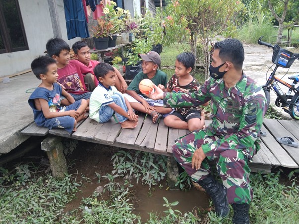 Kubu Raya – Sertu Hartono anggota satgas TMMD ke-111 Kodim 1207/Pontianak manfaatkan waktu istrahat siang untuk ngobrol dan bermain bersama anak-anak Dusun Maju Jaya, Desa Kuala Mandor B, Kecamatan Kuala Mandor B, Kabupaten Kubu Raya, Selasa (29/06/2021).