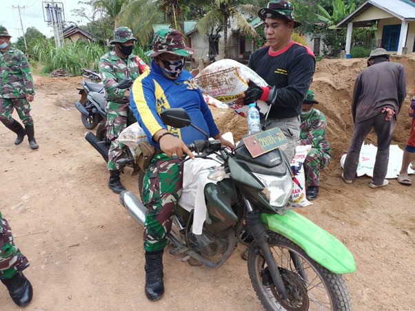 Kubu Raya – TMMD ke-111 TA. 2021 Kodim 1207/Pontianak sudah dibuka, pekerjaan fisik pun dimulai namun anggota satgas TMMD harus melangsir bahan material ke titik awal pengerjaan rabat beton menggunakan sepeda motor dinas dan sepeda motor warga setempat, Rabu (16/06/2021).